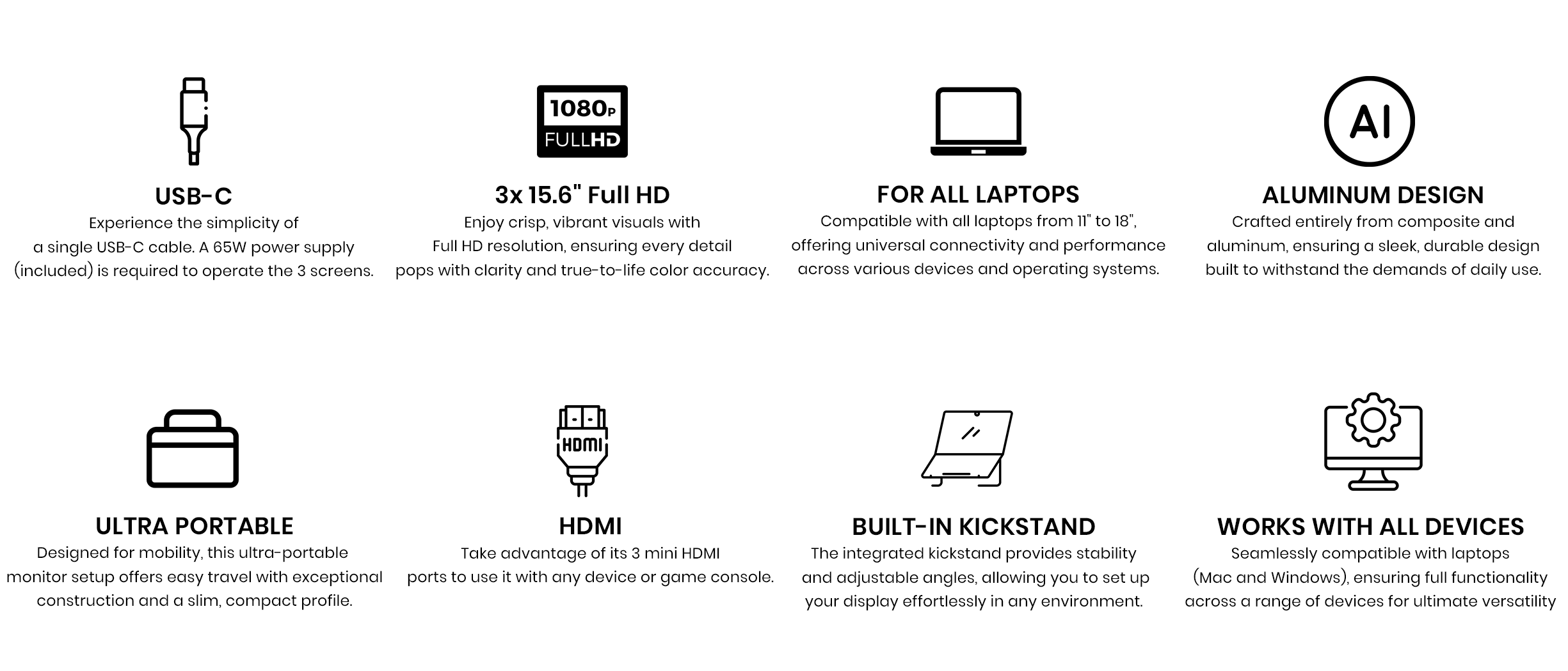Expand your laptop with three extra 15.6" monitors. It connects with USB-C to your laptop or 3 mini-HDMI (if your laptop/desktop supports it). A 65W power supply (included) is required to operate the 3 screens.