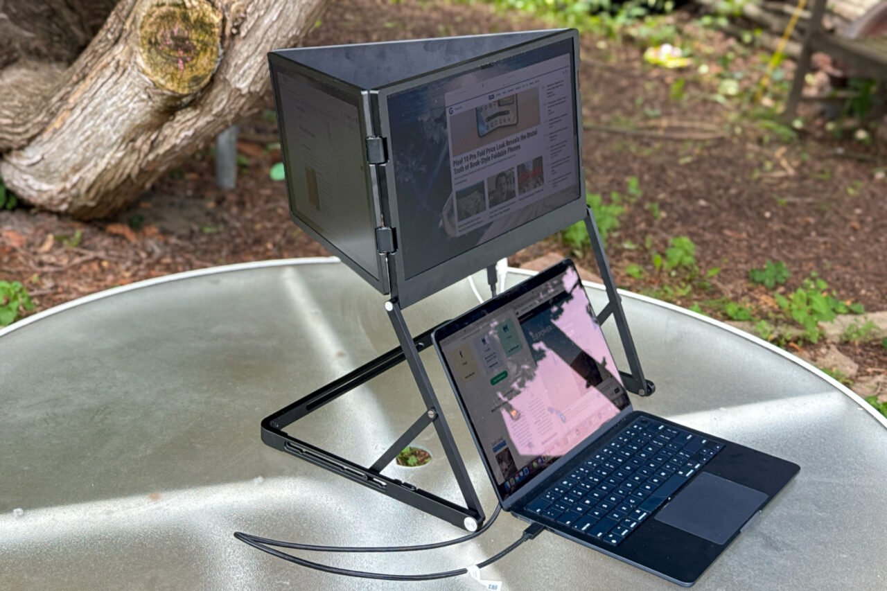 This groundbreaking design expands your screen real estate without sacrificing portability, giving you an immersive, eye-level viewing experience wherever you work.
