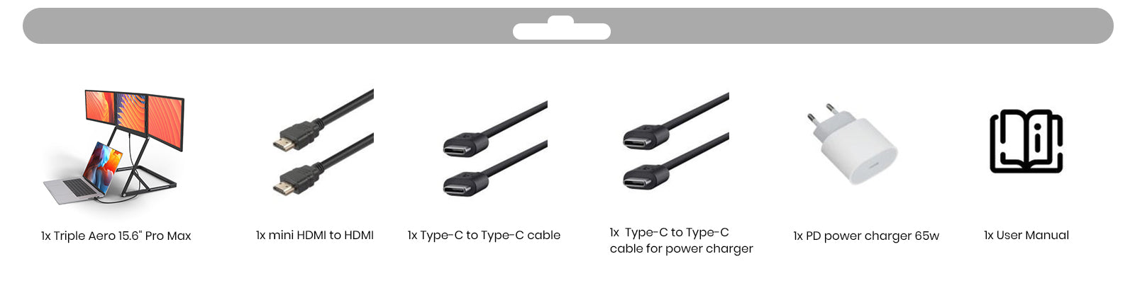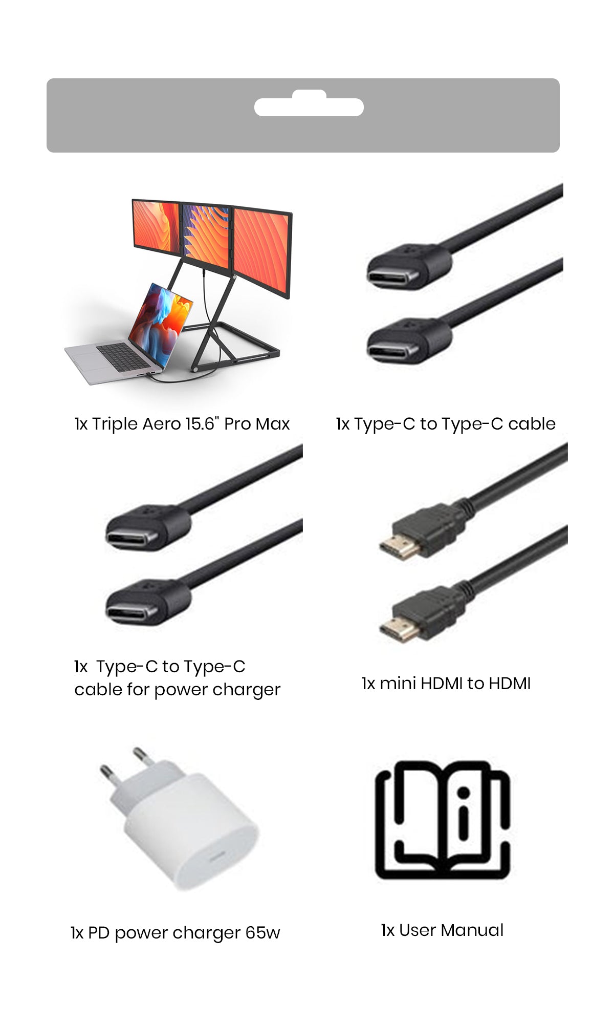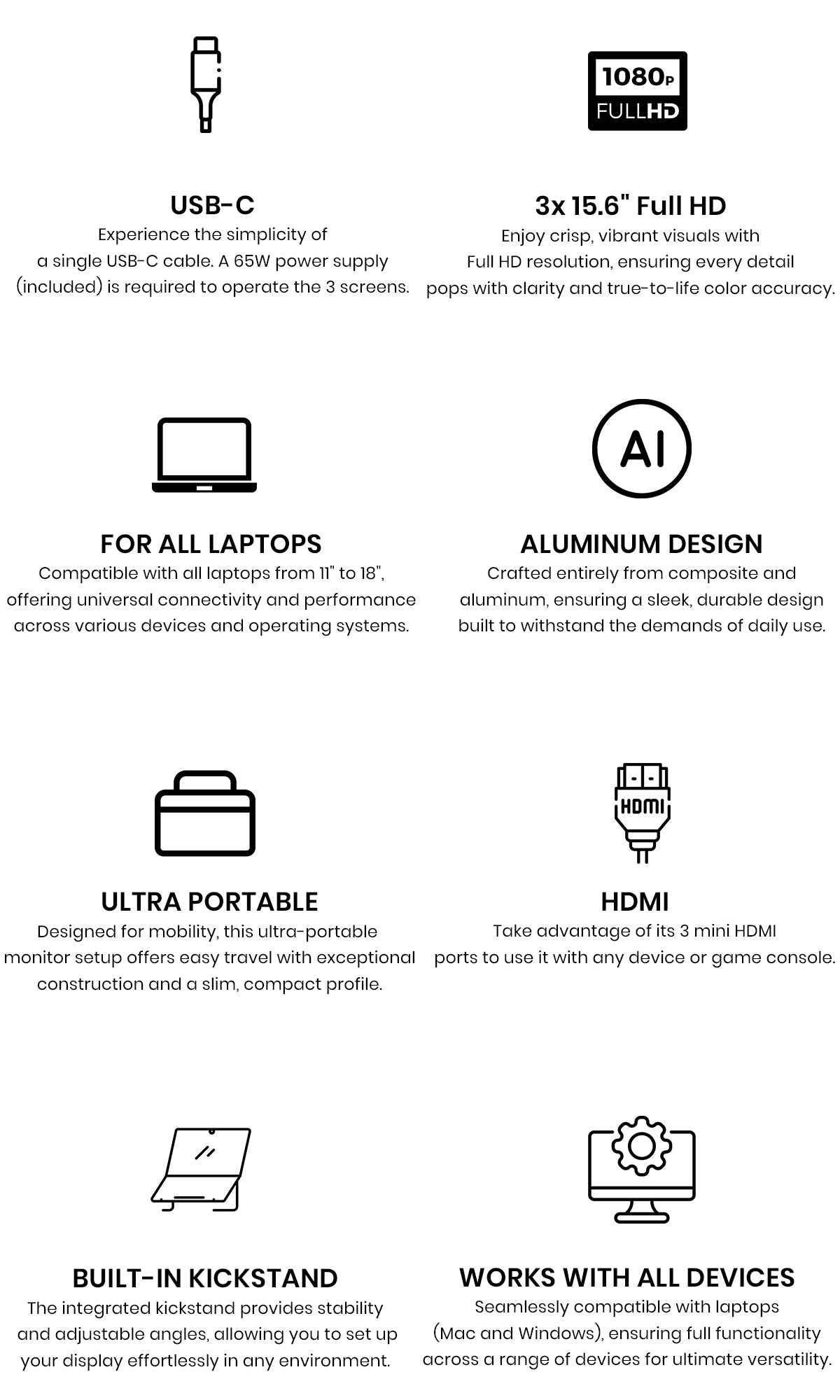 Introducing the Nimbus Pro 15.6, the ultimate cockpit-style productivity booster. Crafted from premium aluminum accents, it features three 15.6-inch Full HD anti-glare monitors. It connects with USB-C to your laptop. A 65W power supply (included) is required to operate the 3 screens. Perfect for professionals on the move.